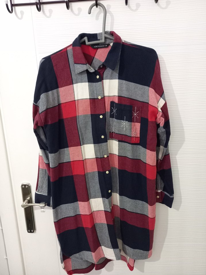 Kadınlar için düğmeli, uzun kollu, yakası kesimli midi boy, bol kesim gömlek. Bordo, lacivert ve gri ekose desenli yumuşak tekstil kumaştan, günlük kullanıma uygun. hiç bir deformasyon yoktur. çok az kullanıldı. 38 beden fakat bol kesim 38 40 beden olur.