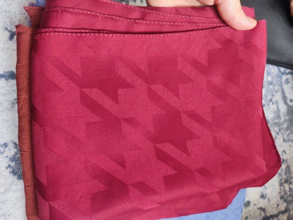 Kadınlar için bordo renkli, fermuarlı ve geometrik desenli şal. Düz ve sade tasarıma sahip, yumuşak sentetik kumaftan üretilmiştir.