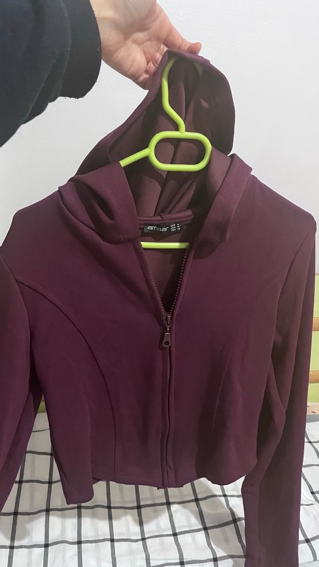 Ambar markalı, Yüksek yakalı, fermuarlı bordo sweatshirt. Uzun kollu ve vücuda oturan kesim. Cropumsu (ölcülerini sorabilirsiniz)