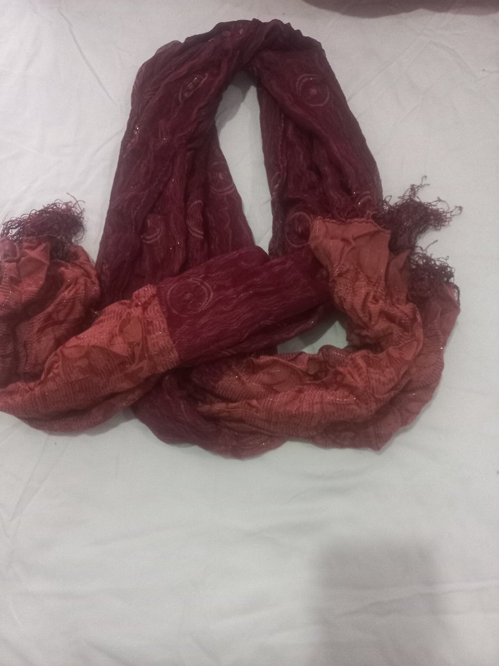 Kadınlar için parlak bordo renkte, ipeksi dokulu ve drapeli tasarıma sahip bohem ve retro tarzda bir şal. Hippie esintisi katar.