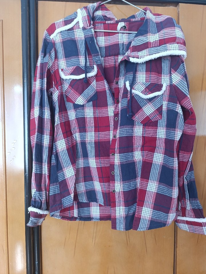 Pamuklu, bordo kareli desenli, uzun kollu, düğmeli, yakalı, bol kesim kadın gömleği. Xxl beden fakat kalıbı dar L ve Xl ye daha iyi olur.