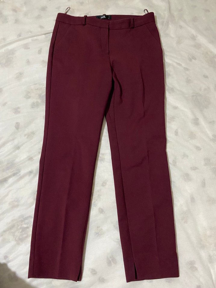 Bordo renkte, midi boy, regular fit kadın kumaş pantolon. Fermuarlı ve ofis kullanımı için uygun, trend normcore tarzda.