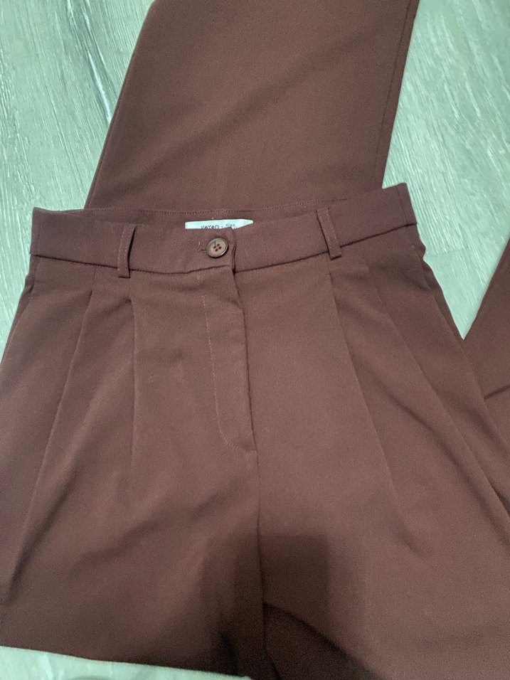 Kadın bordo kumaş pantolon, pilili detaylı ve normal boyda. Sentetik kumaştan üretilmiş, ofis için uygun.