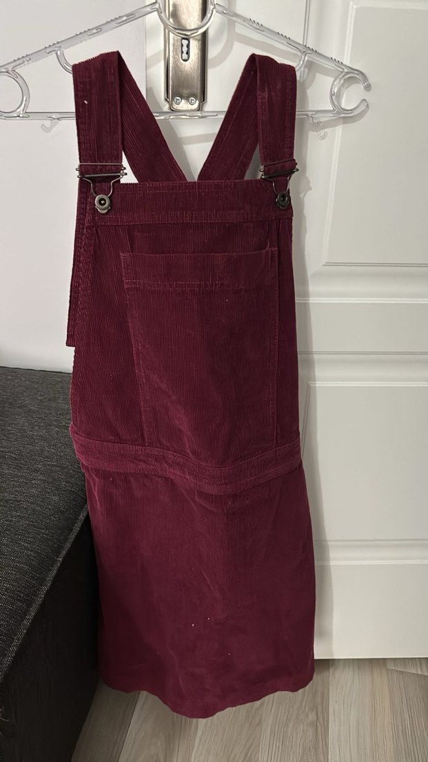 Bordo renkli, süet kumaştan yapılmış, kemerli ve askılı, yüksek yakalı, fit kesim midi salopet. Rahat ve şık, günlük kullanıma uygun.
