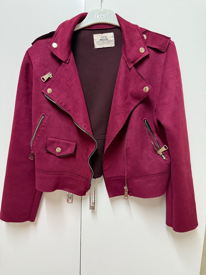 Bordo süet malzemeden, kısa ve dar kesim biker ceket. Çıtçıtlı yaka ve fermuarlı detaylara sahiptir. Günlük kullanıma uygundur. Fermuar hatası var sadece