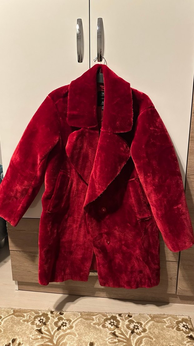 Kadınlar için bordo parlak süet kumaştan, bol kesim ve kesik yakalı midi kaban. Uzun kollu ve kürk detaylı, romantik akşamlar için cesur sokak stiliyle uygun.