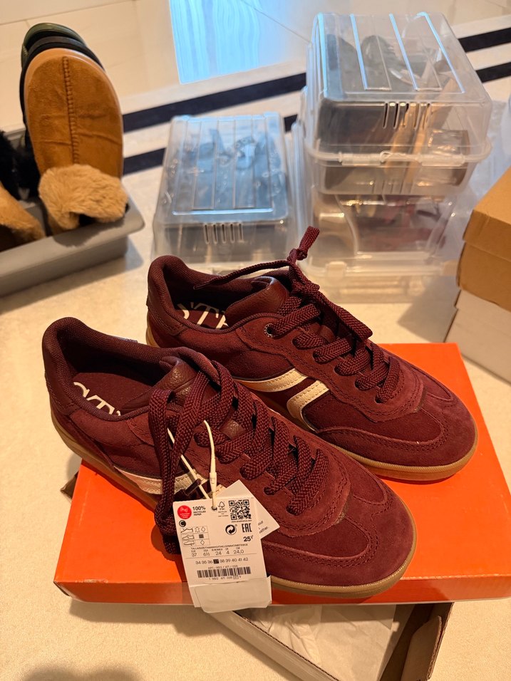 Kadınlar için koyu bordo süet malzemeden yapılmış, baskılı desenli ve düz tabanlı spor ayakkabılar. Ayarlanabilir Velcro detayı bulunur, günlük rahat kullanım için uygundur.