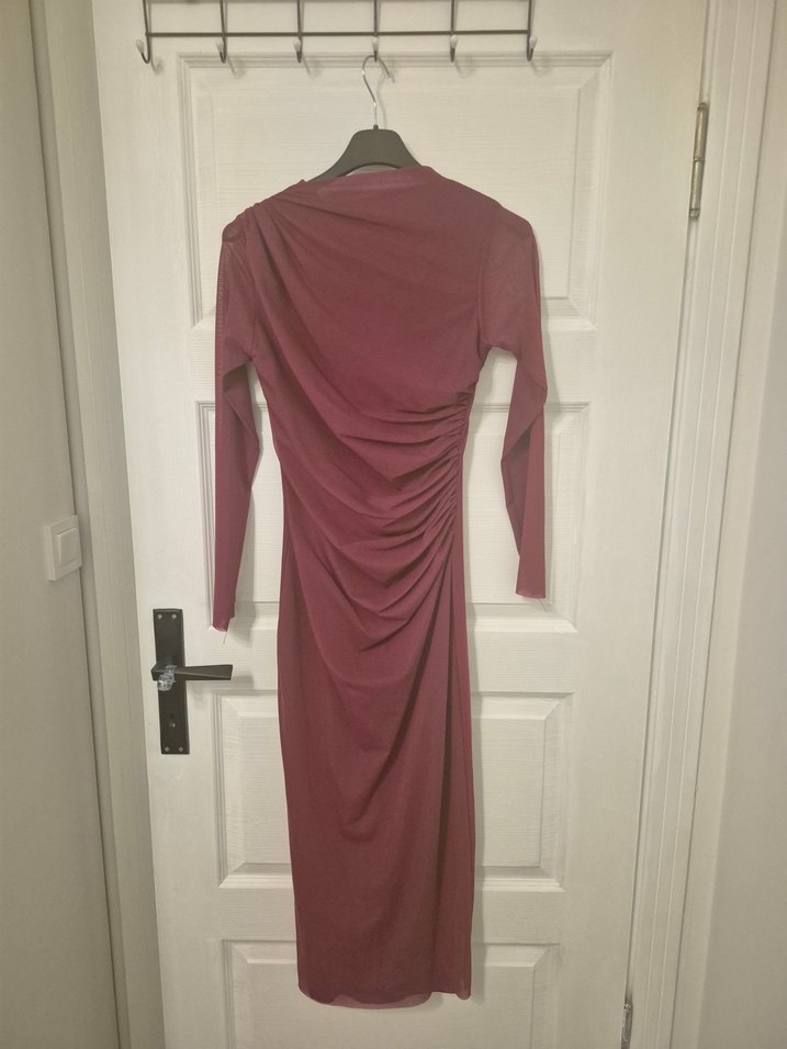 Bordo renkli, uzun kollu ve yüksek yakalı, drapeli tasarıma sahip, ince ve uzun kesim elbise. Romantik akşamlar için ideal.