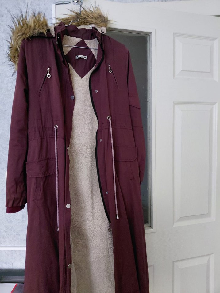 Kadınlar için bordo renkli, uzun ve bol kesim mont. Kapüşonunda kürk detayları ve yakasında kesik yaka bulunur. Yumuşak ve sıcak tutan kumaştan yapılmıştır.