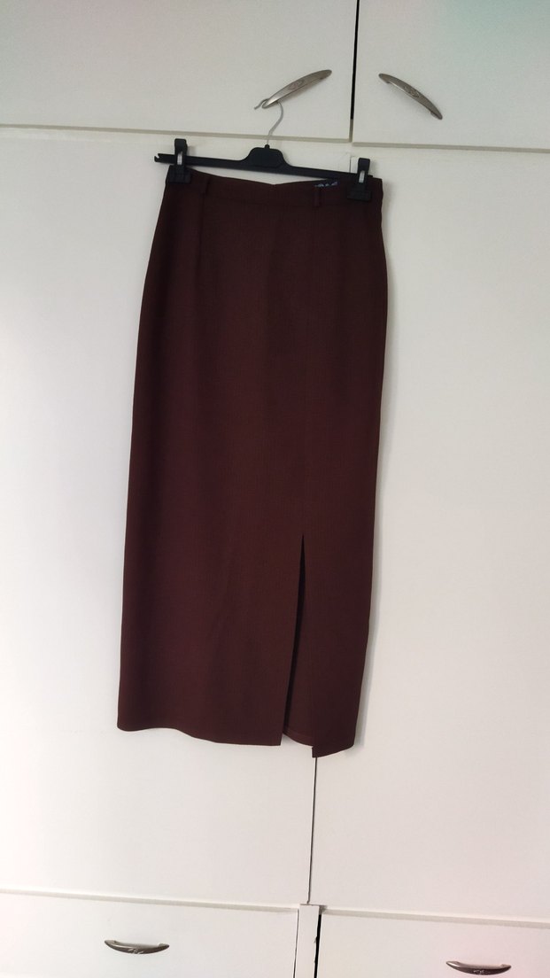 Kadınlar için koyu bordo renkte, saten dokulu, kemerli uzun etek. Ofis kullanımına uygun, düz kesim ve küçük yırtmaçlı, sade ve temel tarzda.