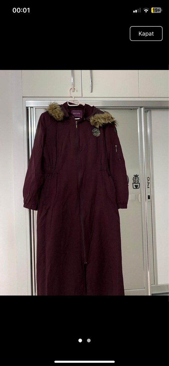 Bordo renkli, uzun ve bol kesim kaban, kürk detaylı ve uzun kolludur. Sıcak tutan kumaşıyla günlük kullanıma uygundur.