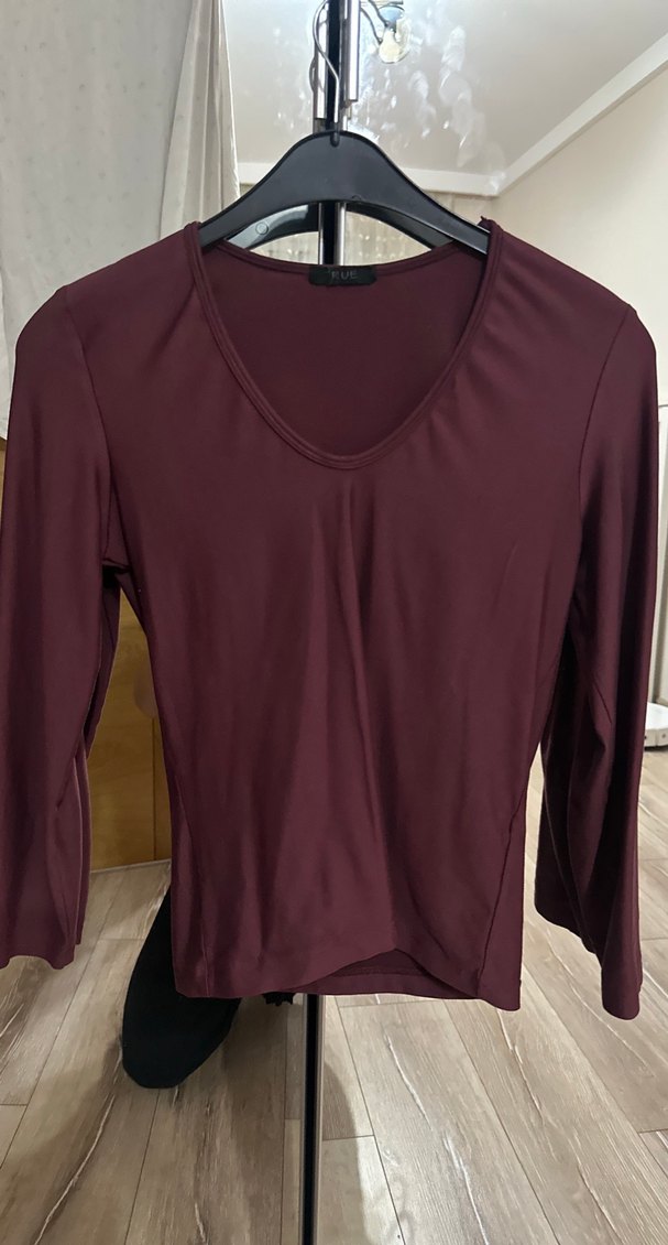 Kadınlar için V yaka ve uzun kollu, bordo renginde, satenimsi dokuda, vücuda oturan bluz. Minimalist ve güncel tarzda, günlük kullanıma uygun. Yarım kol