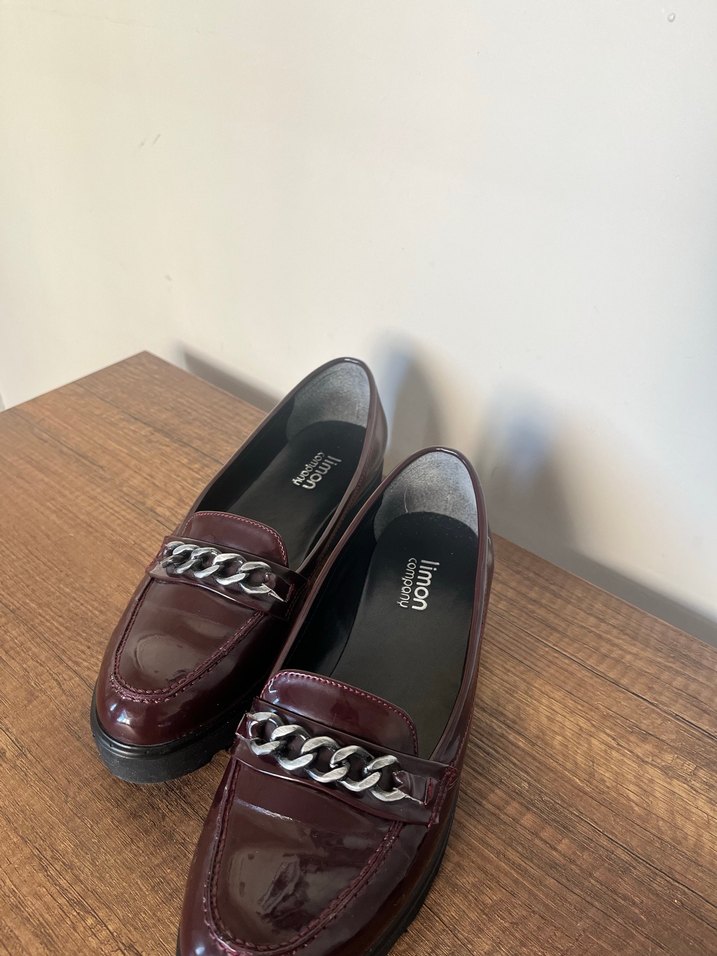 Bordo parlak deri loafer, blok topuklu, yılan desenli ve zincir detaylı, şık ve rahat ofis ayakkabısı.