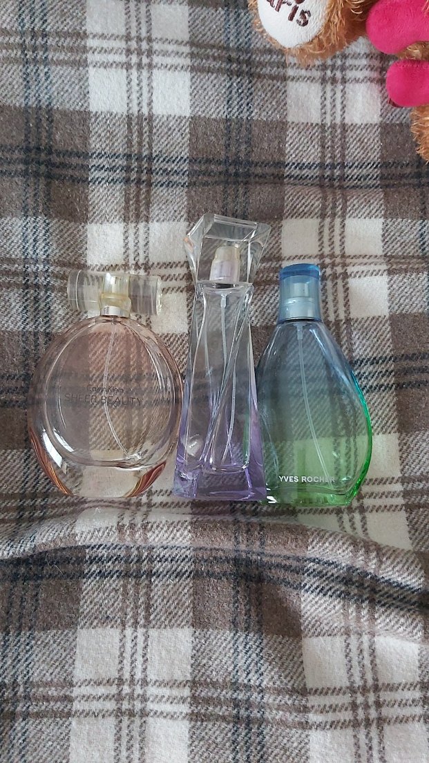 Şeffaf oval, uzun keskin ve Yves Rocher, Lancome, Çalıntı Klein marka mavi-yeşil degrade olmak üzere üç farklı şişe tasarımına sahip kadın boş parfüm şişeleri #Lancome #YvesRoxher #CalvinKlein #şişe #parfüm #dekorasyon #aksesuar