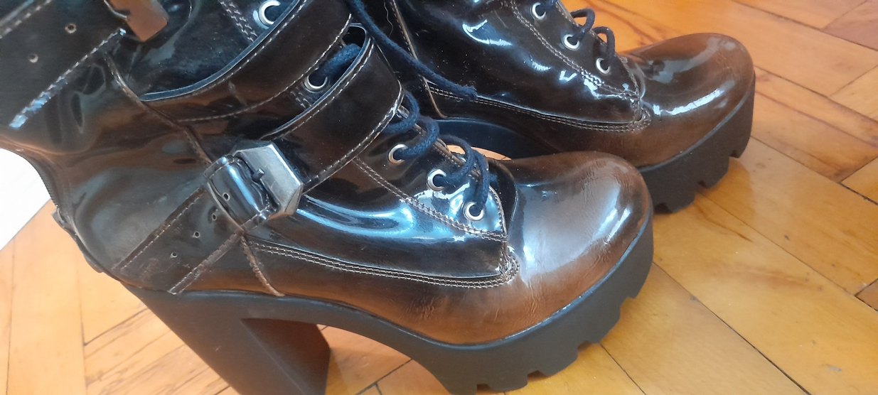 Kahverengi deri, parlak yüzeyli botlar, kemer detaylı ve sivri topukludur. Gotik ve avangart tarzlara uygundur, günlük kullanım için idealdir.