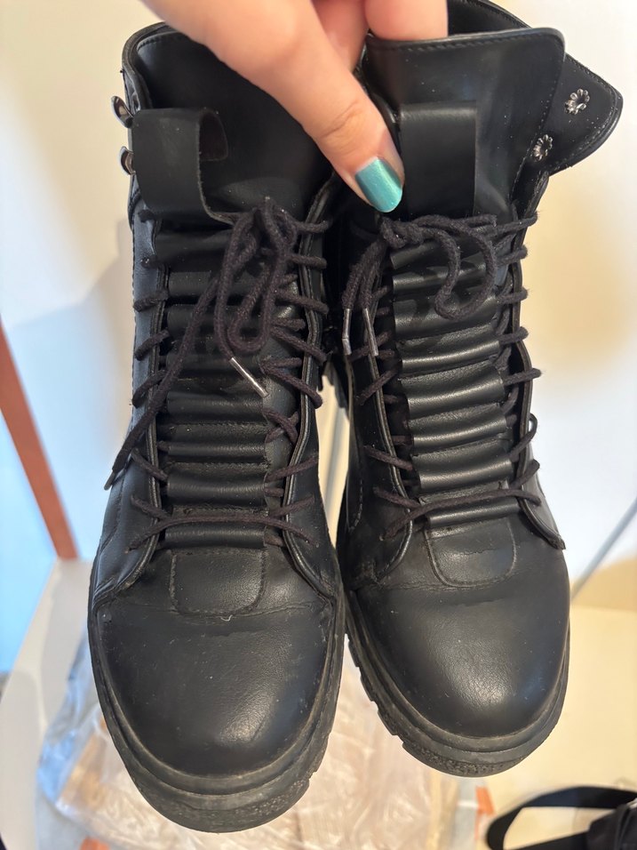 Siyah renkli, bağcıklı ve tokalı, lastik malzemeden yapılmış, stiletto topuklu kadın botu. Goth tarzında, günlük kullanıma uygun. Ürünün kusuru görünmektedir hafif deforme vardır