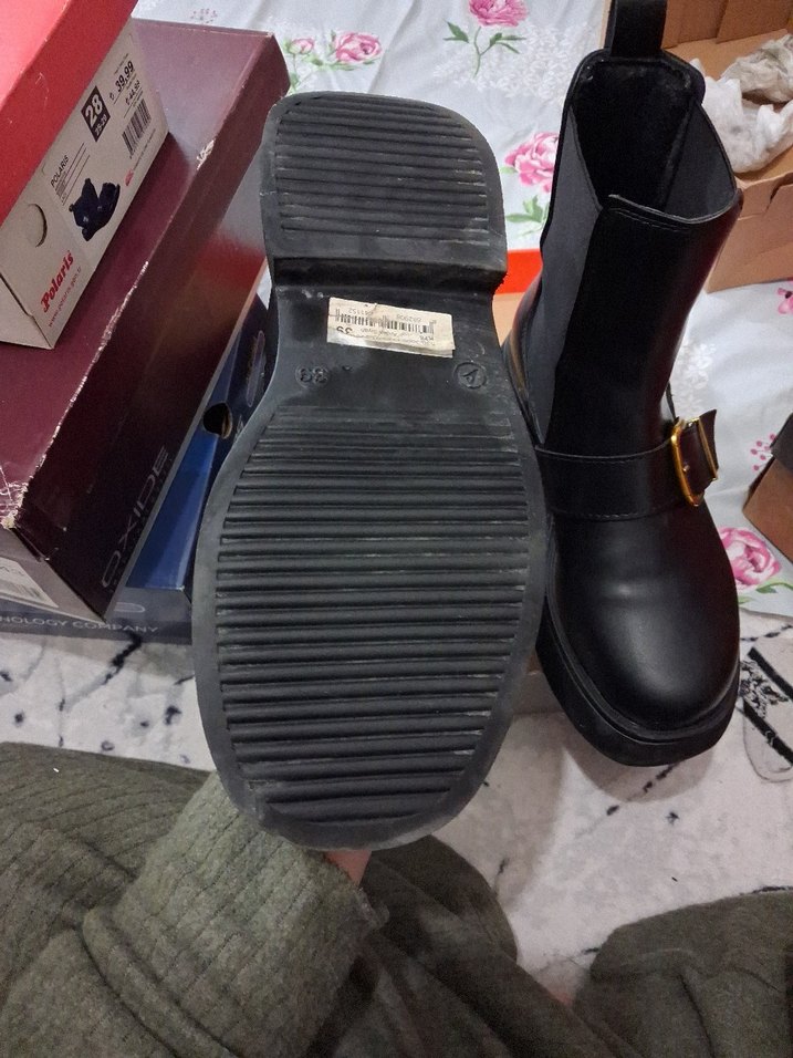 Siyah kauçuk kadın botları, platform tokalı, trend sokak stili için uygun. Günlük kullanıma ideal. 2 defa giyildi sadece