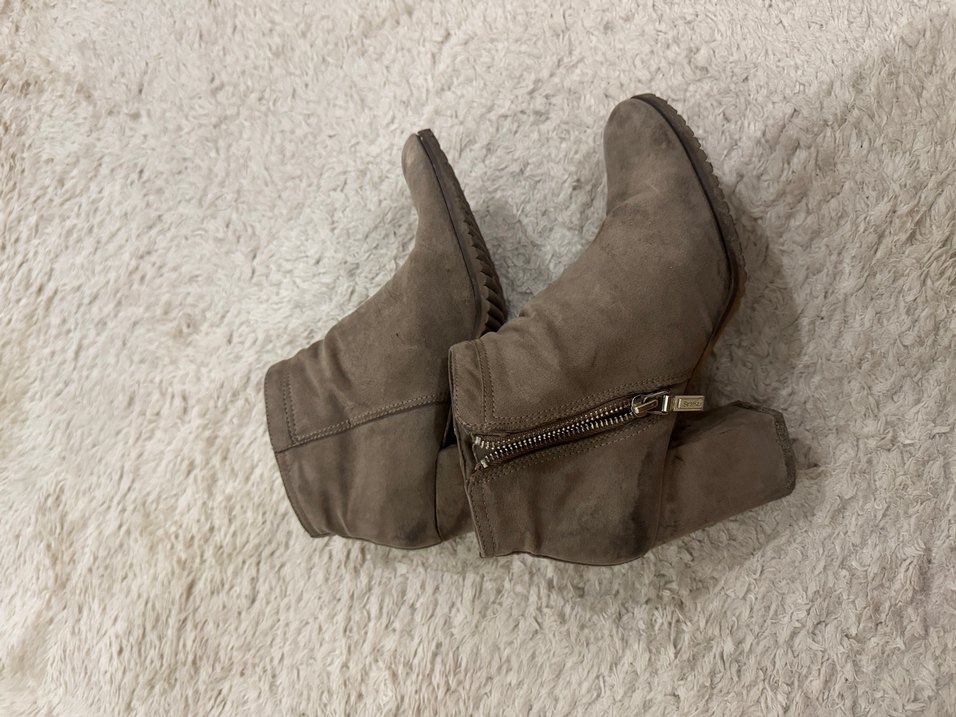 Üründe herhangi bir hasar yoktur. Bej süet kadın bot, dolgu topuklu, yan fermuarlı. Rahat ve desensiz, günlük kullanım için uygun.