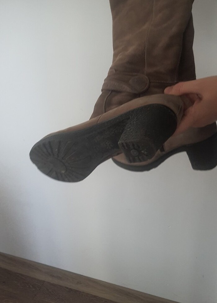 Hakiki deridir. Ünlü bir ayakkabıcıdan almıştım. 38 numara, sıcacık tutuyor hem de çok şık detayları. Ürünü çok giyemedim hamilelik izin vs derken, ama beklerken düzgün koymadığım için duruşu böyle , giydikçe düzelir. hayırlı olsun
