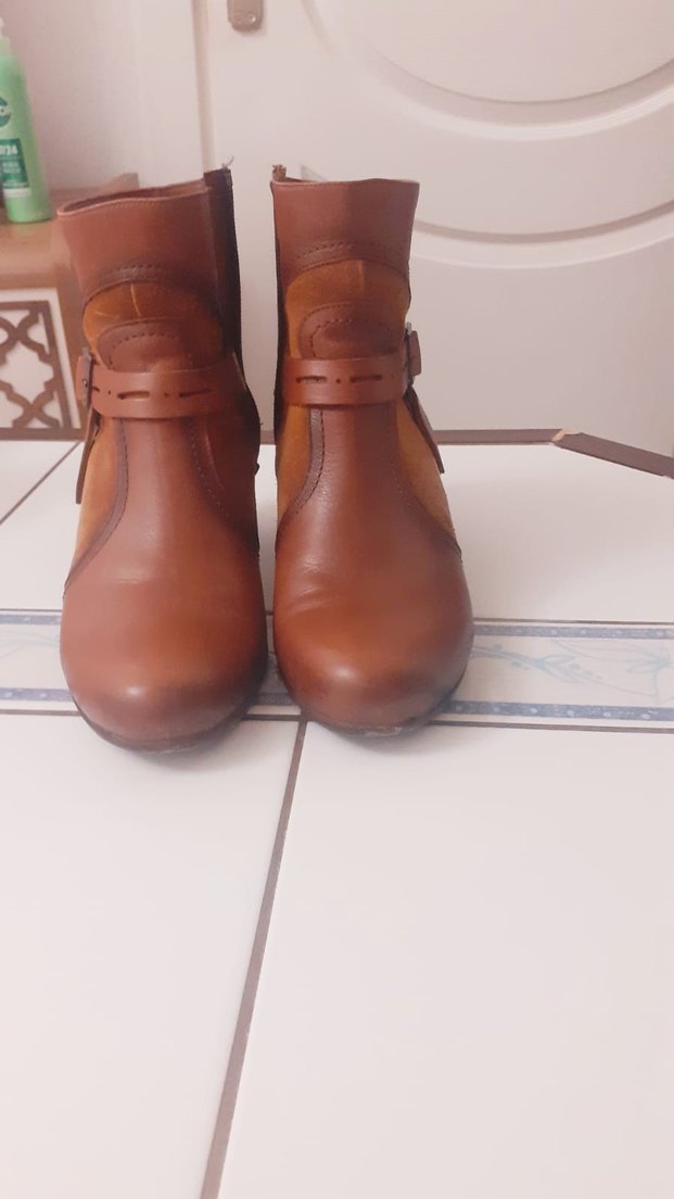 Kahverengi deri, parlak yüzeyli kadın botları, tokalı ve dolgu topuklu, günlük kullanıma uygun.