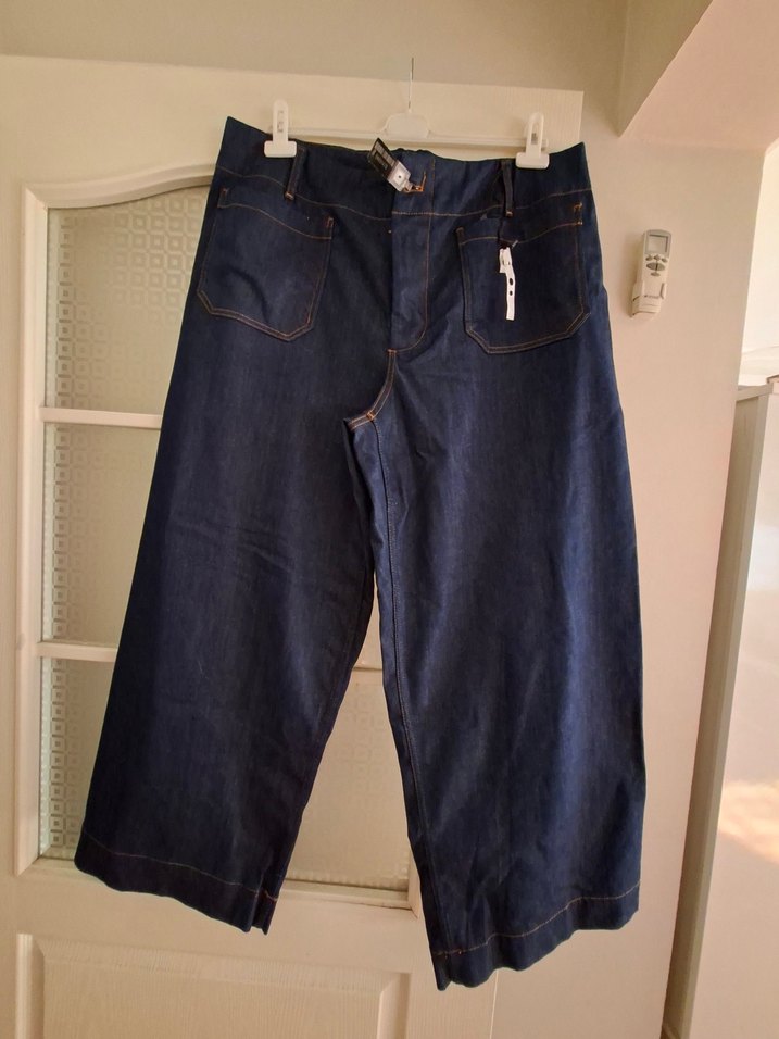 Lacivert renkte, , bol kesim midi uzunluğunda kadın jean pantolon. Günlük ve sokak stiline uygun.ölçü görselledim düğmesi köpük modern spor kaliteli tarz markasi kopuk en son fotuda ayni markadan baska bir pantolunun görselini attimm