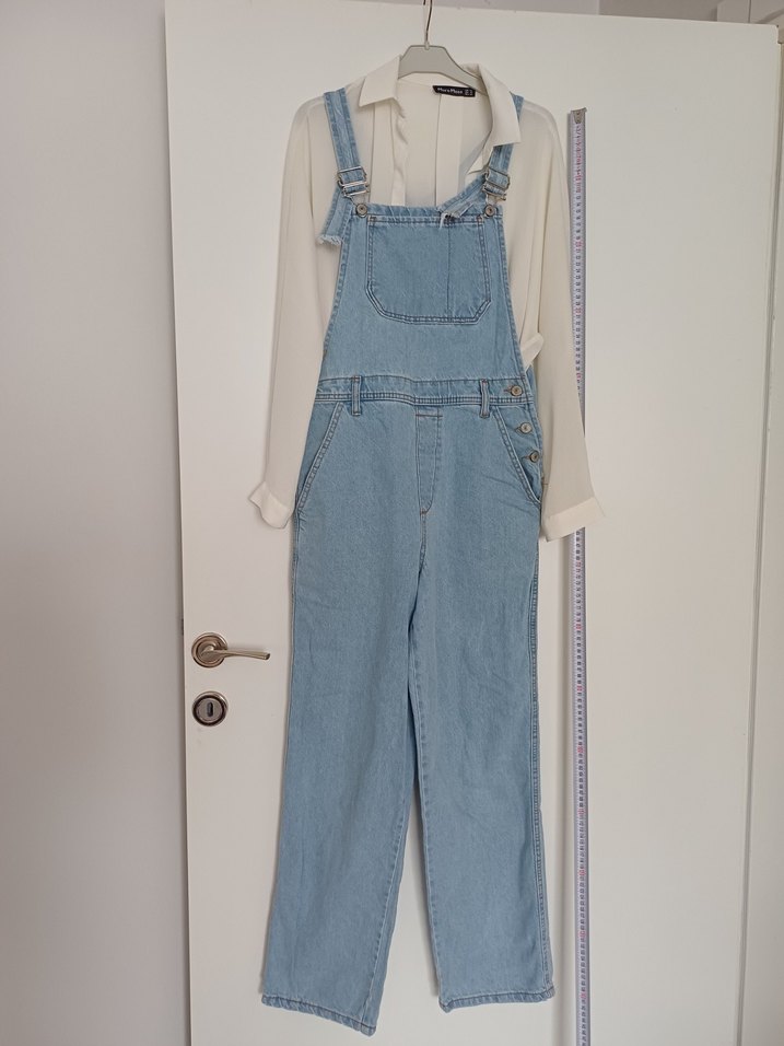 Ayarlanabilir askılı, bol kesim midi kot salopet. Rahat ve şık sokak stili için ideal, günlük kullanıma uygun.