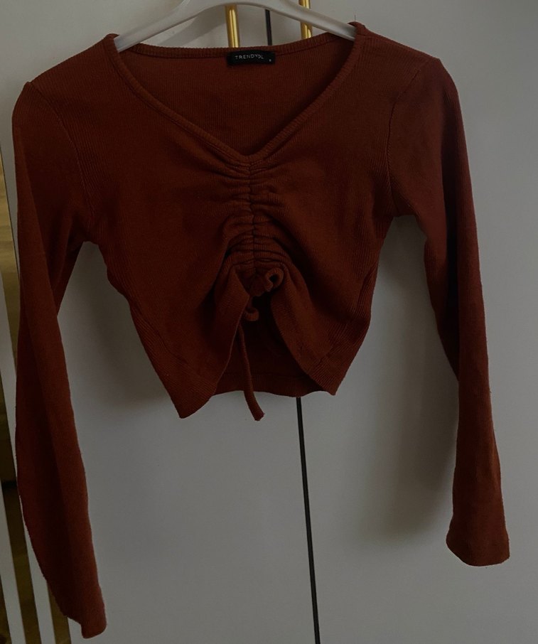Kadınlar için uzun kollu, ön kısmı büzgülü ve ayarlanabilir bağcık detaylı kısa kesim bluz. Derin V yaka ve esnek, rahat kumaştan üretilmiştir.