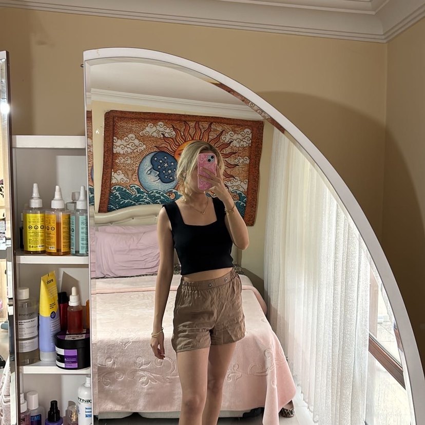 Kadınlar için camel renkli, bağlama desenli, kısa ve bol kesim crop top. Askısız, rahat ve günlük kullanıma uygun şık tasarım.