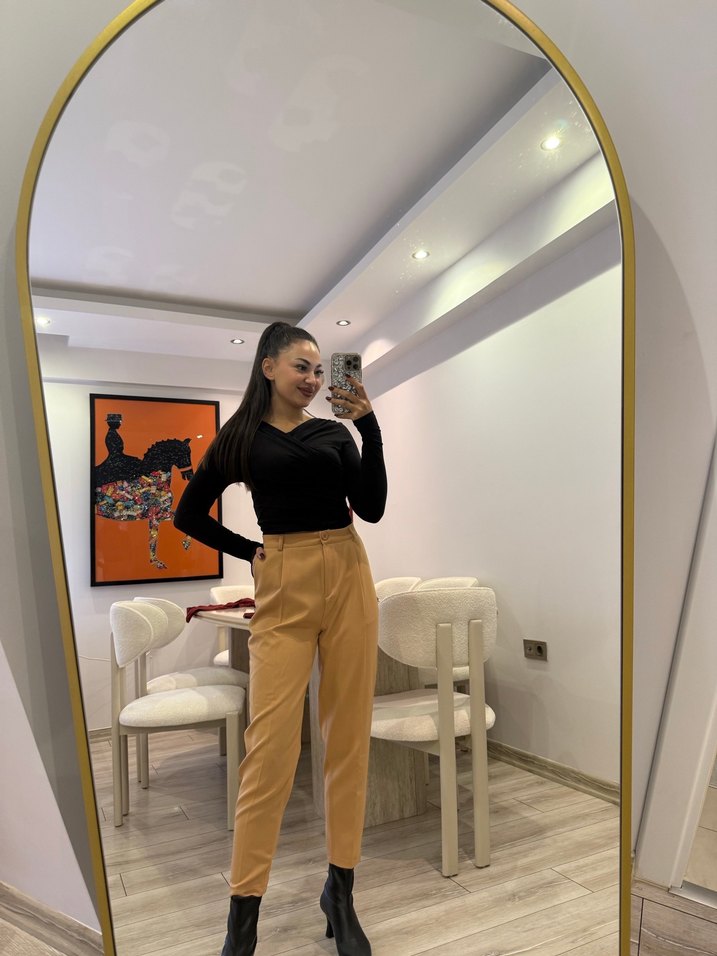 Kadın Camel Deri Cigarette Pantolon
