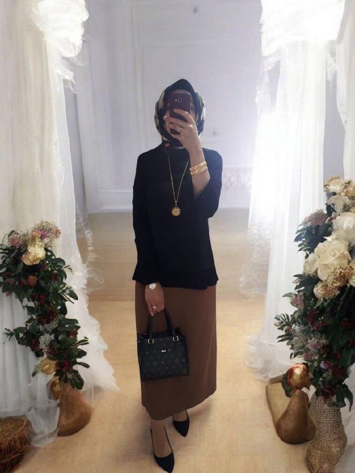 Kadın Camel Etek, siyah alt tarafı piliseli gömlek kombin