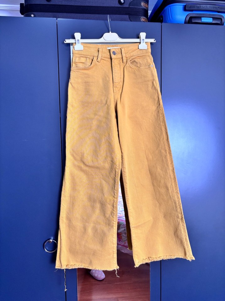 Bol kesim, midi boy, kemerli camel renk kot pantolon. Günlük kullanım için uygun, sade ve rahat bir sokak stili sunar. Bedenini yakından çektim alırken dikkatle bakın lütfen