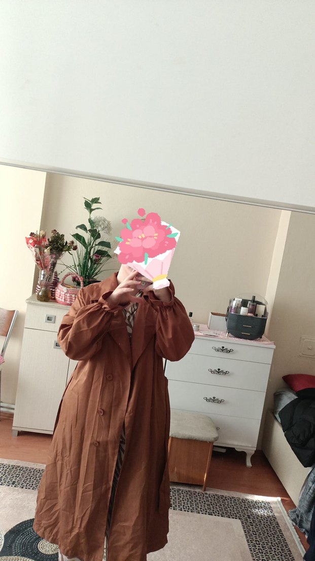 Midi uzunlukta, camel renkli, notched lapel yakalı ve uzun kollu, bol kesim trençkot. Kağıt benzeri materyal ve baskılı desene sahip, minimal ve retro tarzda. Şeffaf detay içerir.