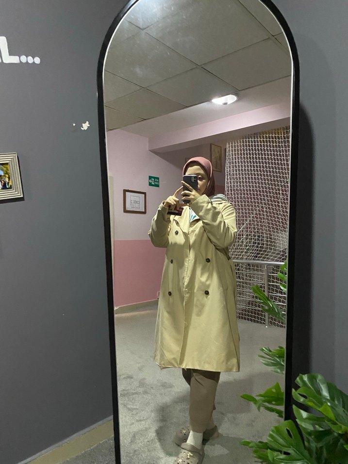 Kadınlar için camel midi trençkot, pamuklu yumuşak kumaştan, bol kesim ve kesik yakalı. Uzun kollu, günlük kullanıma uygun sokak stili.