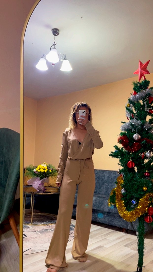 Kadın camel rengi midi boy, uzun kollu, V yaka ve salaş kesim tulum. İpeksi kumaştan, minimal ve şık bir günlük stil sunar. ✨