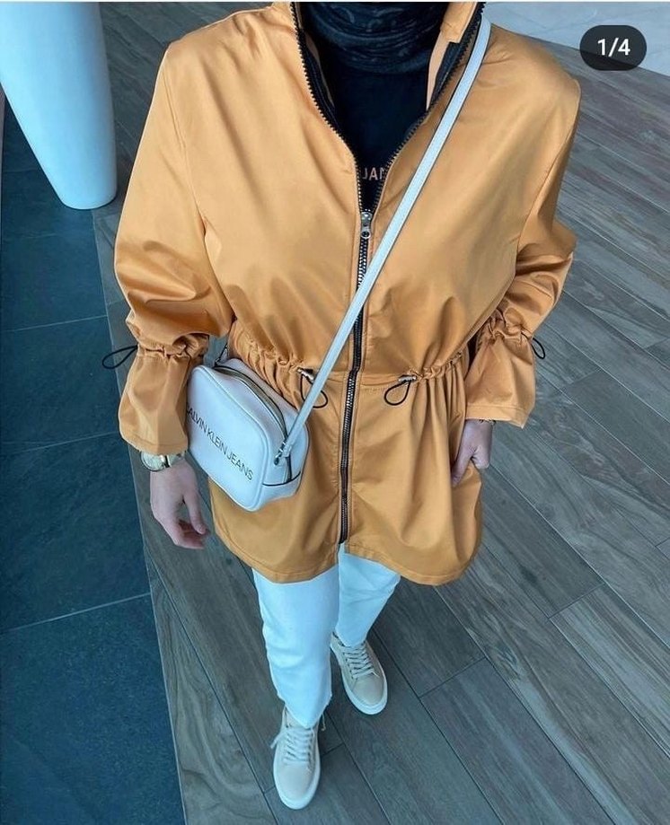 Camel renginde, kemerli ve bol kesimli kısa trençkot. Askılı kollu ve yüksek yakalı, sentetik kumaştan üretilmiştir. Rahat sokak stili için uygundur.