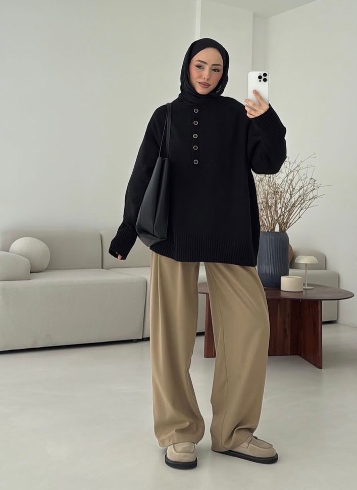 Kadınlar için yün kumaştan yapılmış, bol kesim ve camel renkte, rahat ve şık günlük kullanım pantolonu.