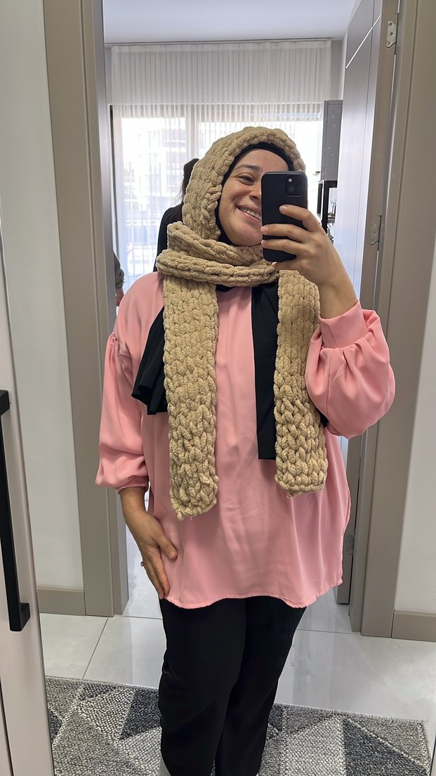 Yumuşak örgü kumaştan yapılmış camel renkli kadın atkısı, trend sokak stiline uygun rahat ve pastel tonlarda.