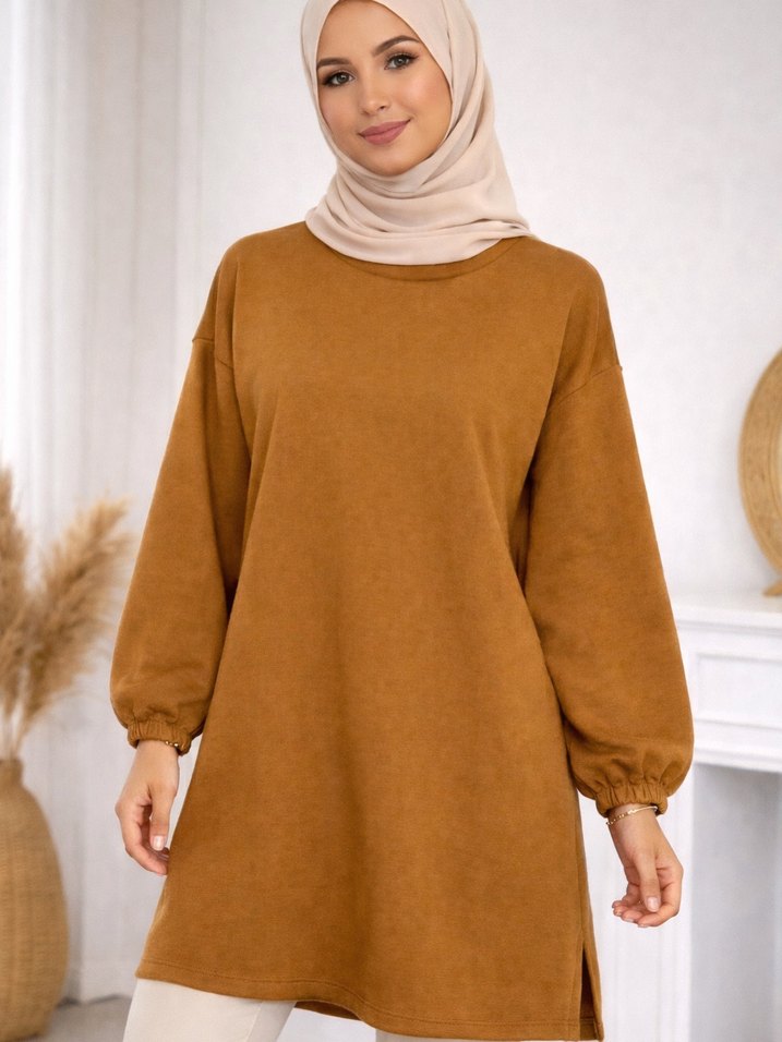 Kadın camel renk salaş kesim, yuvarlak yaka ve uzun kollu tunik. Yumuşak ve sıcak kumaştan, günlük kullanıma uygun rahat ve sade bir tasarım sunar. Midi boy ve zahmetsiz şıklık sağlar. ✨