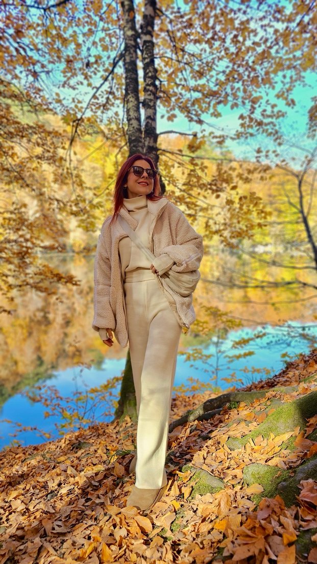 Camel renkli, yüksek yakalı ve uzun kollu bol kesim kadın takımı. Yumuşak, sıcak kumaş ve kürk detaylı, dış mekan kullanımı için uygun rahat bir model.