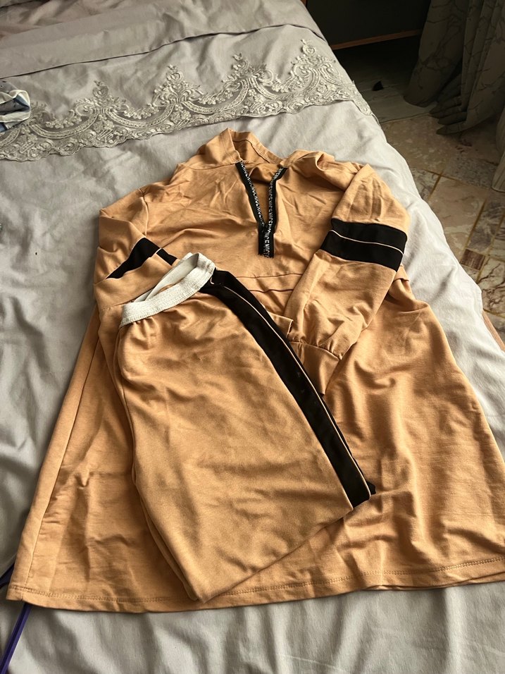 Kadınlar için kemerli, uzun kollu, midi boy, bol kesim spor takım. Parlak sentetik kumaştan, yüksek yakalı, camel renk ve siyah şerit detaylı.