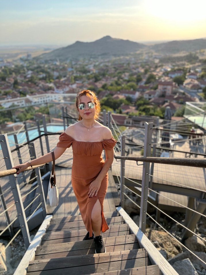 Fitted kesimli, camel renkli midi elbise, straplez ve ince askılı detaylara sahip. Hafif saydam sentetik kumaştan, dış mekan sokak stili için uygundur.