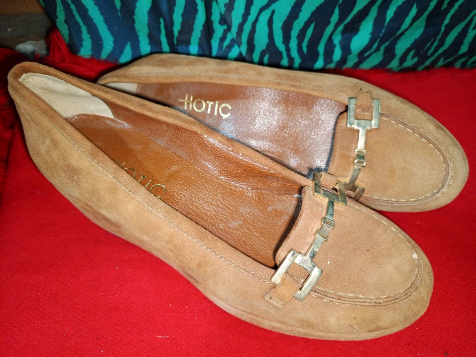 Camel renkli süet kadın loafer ayakkabılar, baskılı desenli ve tokalı detaylıdır. Dolgu topuklu ve parlak yüzeylidir, bohem tarzı için uygundur. Marka: HOTIC.