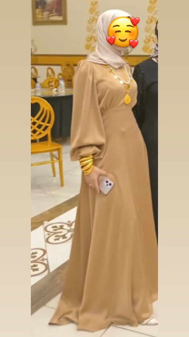 Kadınlar için uzun, camel renginde, drapeli ve uzun balon kollu elbise. Saten kumaş,sade ve şık, düğünler için uygun.