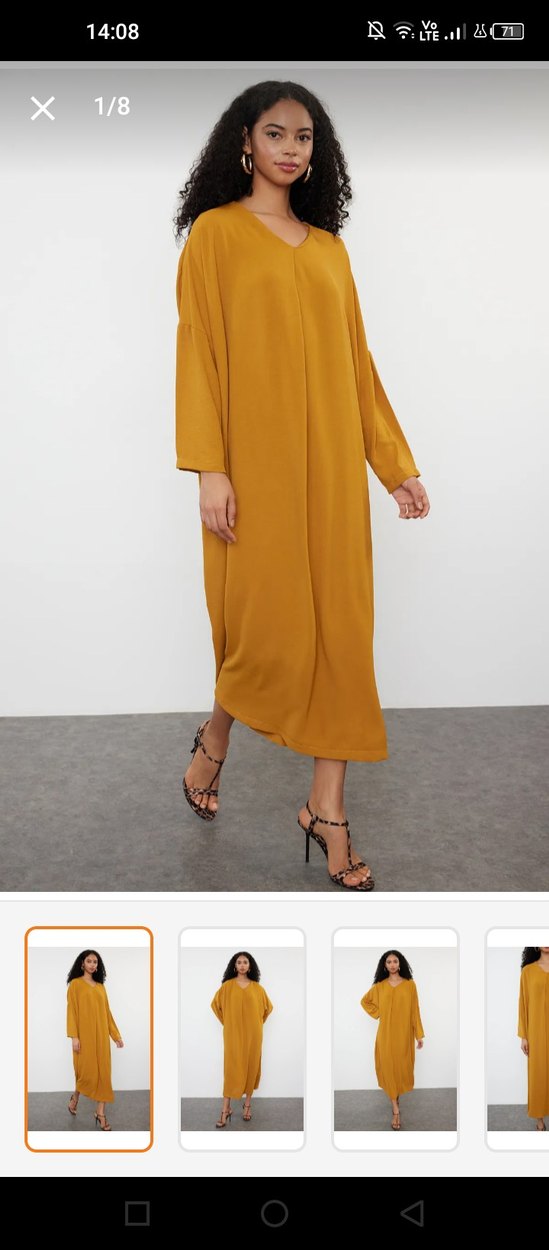 Kadınlar için uzun, salaş kesimli, dökümlü ve parlak camel renginde elbise. Uzun kollu ve V yaka, ipeksi dokusuyla rahat kullanım sunar.
