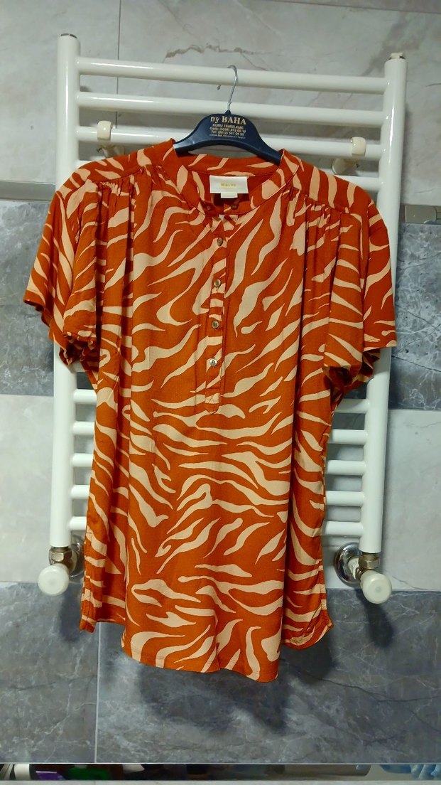 Düğmeli V yakalı, kısa kollu, bol kesim kadın bluz. Parlak camel zebra desenli, bohem tarzda, normal boyda, yumuşak sentetik kumaştan yapılmıştır.