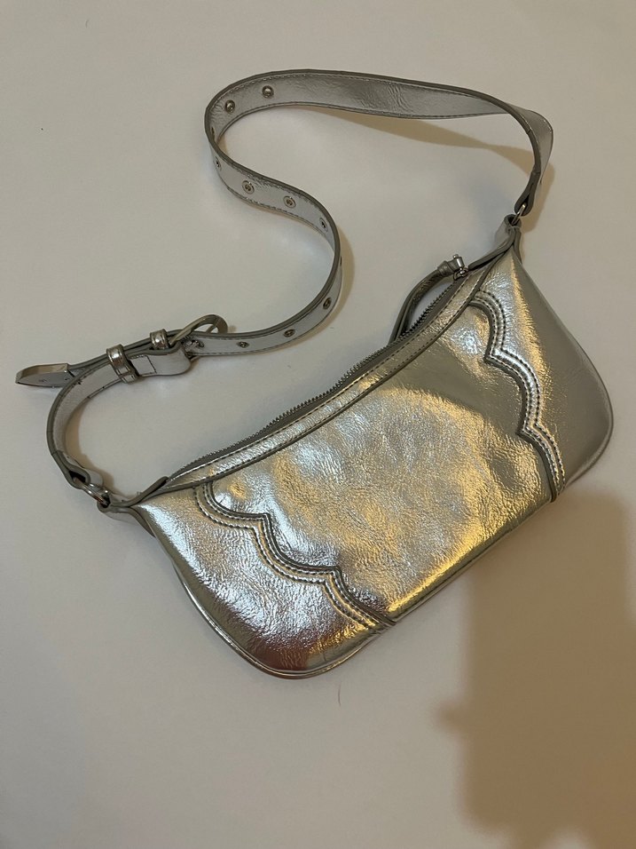 Parlak gümüş renkli kadın çanta, tokalı askısı ve hafif yılan derisi desenine sahiptir. Romantik buluşmalar için uygundur.