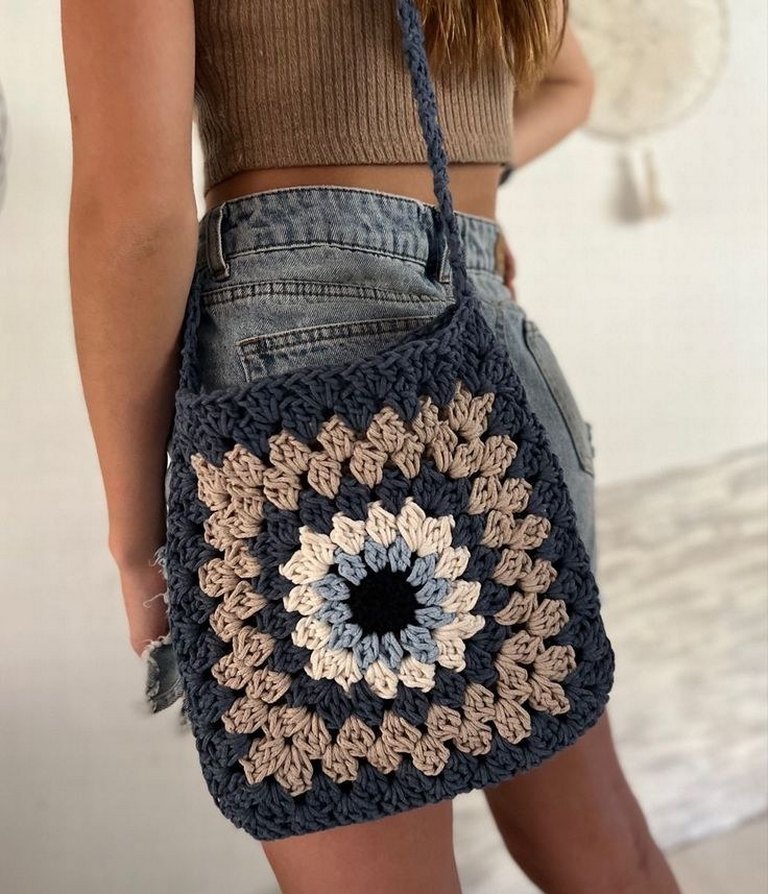 Bohem tarzda, mavi ve gri tonlarda mandala desenli kadın çanta. Günlük kullanıma uygun.