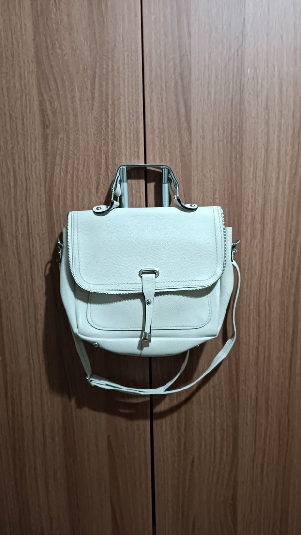 Pastel bej renkte, tokalı kapaklı deri kadın çantası. Minimalist bohem tarzda, düz ve desensiz, günlük kullanıma uygun.