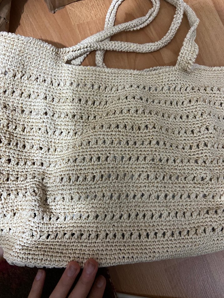 Bej renkte, dantel detaylı örgü kadın çantası. Minimalist bohem tarzda, günlük kullanıma uygun, yumuşak dokulu ve desensiz.