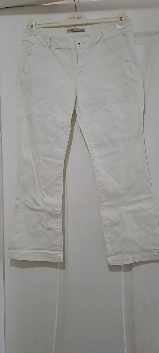 kırık beyaz rengidedir tam beyaz değildir hafif ispanyol paça normal bel 1 sezon kullanilmıstır paçasinda mandal lekesi oluşmuş ve cep kenarında çok hafif kalem lekesi var ağ kısminda belli belirsiz tüylenme mevcut uzun süre kullanılmadığı için baza altında kırışmış yırtığı sökügü yoktur yeni gibi